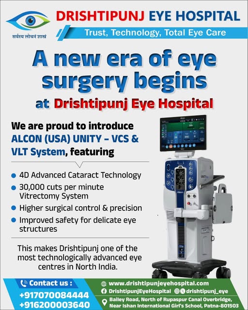 Drishtipunj Eye Hospital proudly marks a new era of eye surgery in 2026 with the introduction of the advanced ALCON (USA) UNITY – VCS & VLT System. This latest technology represents a major milestone in our commitment to delivering world-class eye care services in Bihar and North India. The ALCON UNITY system is equipped with 4D Advanced Cataract Technology, offering superior precision and control during surgery. With an ultra-high speed Vitrectomy System performing up to 30,000 cuts per minute, the machine ensures safer, smoother, and highly efficient surgical procedures. This advanced platform provides: • Higher surgical control and precision • Enhanced safety for delicate eye structures • Improved patient comfort and faster recovery • Advanced vitreoretinal and cataract surgical capabilities Under the expert leadership of Dr. Satya Prakash Tiwary and Dr. Bandana Tiwary, Drishtipunj Eye Hospital continues to adopt cutting-edge global technology to provide the best possible outcomes for patients. The installation of the ALCON UNITY – VCS & VLT System makes Drishtipunj Eye Hospital one of the most technologically advanced eye centres in North India. This achievement reflects our dedication to innovation, safety, and excellence in ophthalmology. We remain committed to bringing the latest advancements in eye surgery to our patients and ensuring trust, technology, and total eye care under one roof.